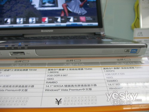 参数方面,联想 天逸 F41AT2390采用英特尔奔腾双核T2390(1.86GHz/FSB 533/1MB二级缓存)处理器,Intel PM965+ICH8M,搭配NVIDIA GeForce 8400M GS(128MB)独立显卡,1GB DDR2内存,160GB SATA硬盘以及内置DVD±RW刻录光驱。网络方面有130万像素摄像头和802.11b/g无线网卡,为本本移动上网带来方便。