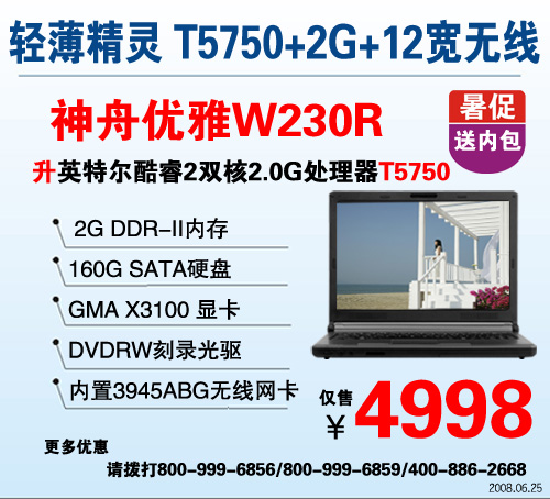 暑促神舟电脑再次引爆笔记本市场,旗下高端品牌代表优雅W230R在售价4998元不变的情况下,再次免费升级处理器至酷睿2双核2.0G处理器T5750。整机以铁灰蓝为主色调,配以经典的黑色,稳重而坚实,外观效果金属质感十分明显,机身线条简洁精致,典雅更具商务气息。上盖正中嵌有Logo,磨砂底纹凸显光亮的“HASEE”字样,简约醒目。12.1寸的高亮宽屏,色彩效果非常出色。升级后高达2.0G的主频,配以2GB内存保证了系统运行流畅。在无线应用日益广泛的今天,本机支持3945ABG无线网卡,满足无线所需。