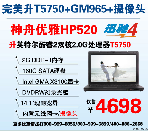 优雅HP520暑促再送惊喜好礼,继降价300元热身后,再次升级处理器至T5750、130W摄像头、GM965芯片组,搭乘完美迅驰4平台,售价仍为4698元不变。不但拥有完美的动力系统,内外兼修的HP520还提供还提供2G DDR-ll内存、160G SATA硬盘、DVDRW刻录光驱、Intel GMAX3100显卡、14.1寸瑰丽宽屏等全面周端配置。以强大的移动计算能力和极致的周端配置来缔造畅快无忧的工作体验!