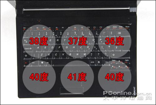 下面再来看一下大家都非常关心的散热问题。总的来说IdeaPad的散热控制不够理想,尤其键盘C面的腕托处以及触摸板区域,升温最为明显。在独立显卡模式下,28度室温环境下常规测试运行2小时左右,触摸板区域最高温度一度达到42度,而双手腕托处也达到40度左右,对操作的舒适度造成较大的影响。另外底部升温同样明显,平均温度在44度左右,双手摸上去会明显感觉得有点烫手,所以这里要提醒用户最好不要把U330放在膝盖上使用。在集显模式下,各区域平均温度下降1-2度左右,但热感仍然较为明显。