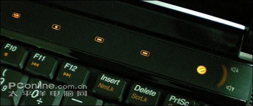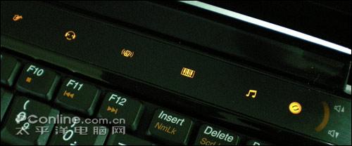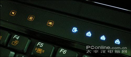 先看左边的功能键设计,分别是静音、功能设置、杜比开关;旁边的四个指示灯分别表现硬盘状态、数字键锁定、大写字母锁定,以及滚动锁定。