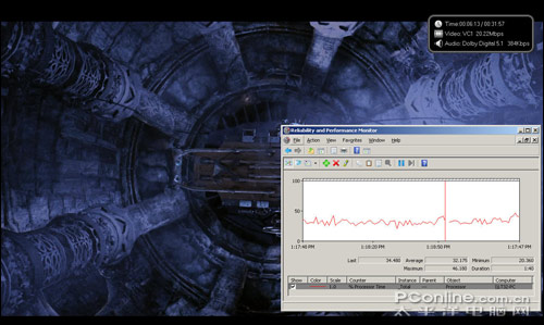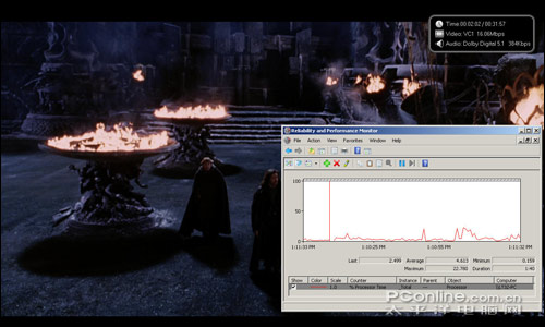 接下来我们再简单看一下在两种显卡模式下的高清播放能力,测试片源为VC-1编码1080P高清规格的《凡·海辛》。可以看到,两种模式下均能非常顺畅的完全高清播放,并且即使是X4500HD集成显卡,在播放高清的同时还能同步进行其它方面的应用操作。这也是迅驰2平台集成显卡的优势提升最为明显的一方面,这一点在此之前的《迅驰2集显性能狂超100% 富士通S6420全国首测》已经提前得到了验证。