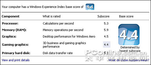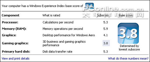 VISTA测试算是比较正常,使用独显模式下,分数明显高于集显;而集显模式下表现也已经相当不错,以较大的距离超越了上代迅驰4平台产品。尤其是DDR3内存的应用,使得内存得分首度逼近了6分,在过去笔记本测试中是绝对罕见的。