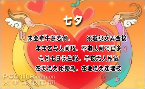 偶然得知,除了牛郎与织女这对倒霉情侣外,"七夕"还源古代人们对时间的崇拜。"七"与"期"同音,月和日均是"七",给人以时间感。古代中国人把日、月与水、火、木、金、土五大行星合在一起叫"七曜"。七数在民间表现在时间上阶段性,在计算时间时往往以"七七"为终局。 "七"又与"吉"谐音,"七七"又有双吉之意,是个吉利的日子。七"又是算盘每列的珠数,浪漫而又严谨,给人以神秘的美感。"七"与"妻"同音,于是七夕在很大程度上成了与女人相关的节日。