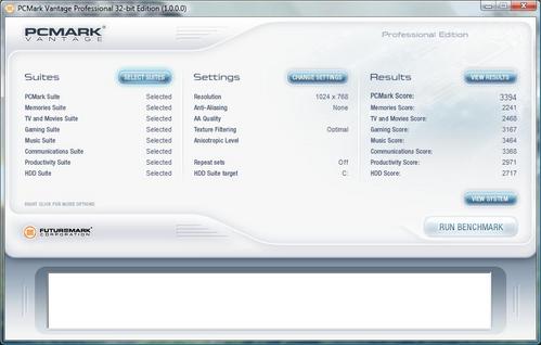 接下来我们将分辨率调制1024*768,通过PC Mark Vantage进行更为详细的整体性能测试,总分为3394分,整体表现令人满意,瓶颈依然出现在图形性能方面。