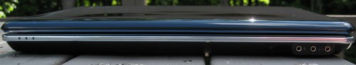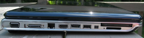 再来看一下接口布局,机身左侧接口较为密集,依次为VGA, 扩展坞接口、网络接口、HDMI接口、eSATA/USB combo、USB、IEEE 1394接口、ExpressCard插槽、四合一读卡器(SD、MS/Pro、MMC、XD)。