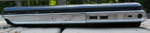 机身右侧为DVD刻录机、电源插口、2个并型的USB接口、RJ11接口、Kensington锁孔。