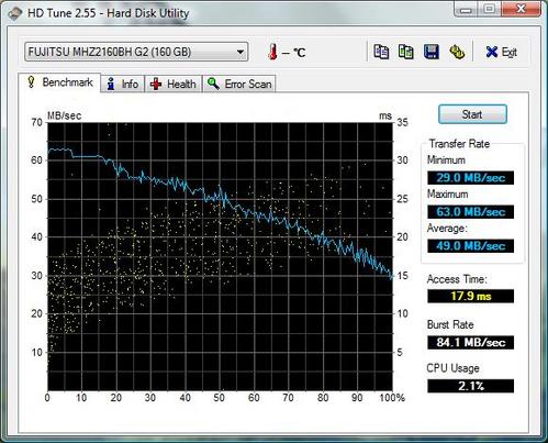 惠普dv5t笔记本采用160GB 5400RPM富士通硬盘,HDTune 2.55测试的结果显示硬盘性能非常稳定,平均数据传输率也达到了5400转硬盘中的较高水平。