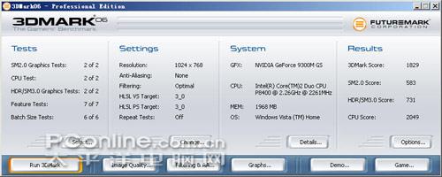 先看看3DMark06的理论测试,9300MGS独显的测试成绩显然也未让人十分满意,与同类显卡相比下降了几百分,但这也掩蔽不了其较出错牟高清及游戏性能。独显测试比X4500HD性能高出了一倍左右,相当不错。不过与其它显卡相比较的话,索尼Z15的9300MGS独显性能与HD3470显卡性能相当。