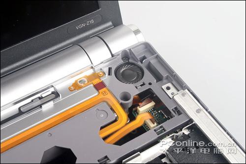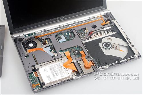 C面板拿下后我们可以看到,索尼Z15的内部布局十分清晰,各主要部件的位置也能看到了个大概。其中我们也注意到由于内部空间非常有限,索尼Z15使用了较多的排线设计,保证了内部的整洁清晰,同时提高各部件的安全性。另外从这里我们也可以了解之前的散热表现,右边几乎没有任何升温,是由于下方是光驱部件;右边下方是处理器等芯片组以及硬盘,所以稍有温感,但已经算是控制得非常好那种。