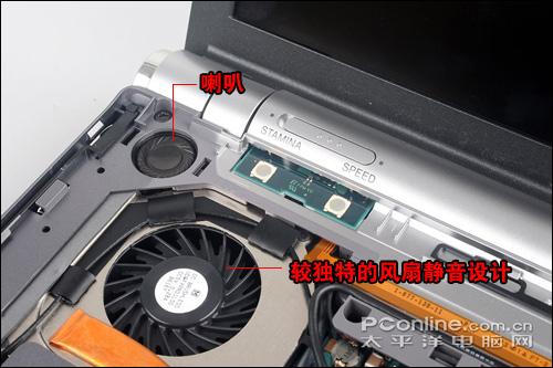 做工不错的喇叭,难怪音质纯正音量也够大;下面的散热风扇别以为只是普通的风扇,仔细观察我们可以看到在涡轮叶上还加入了鱼鳍状设计,有了这东西就可以一定程度上使高速运转的风扇更加静音。