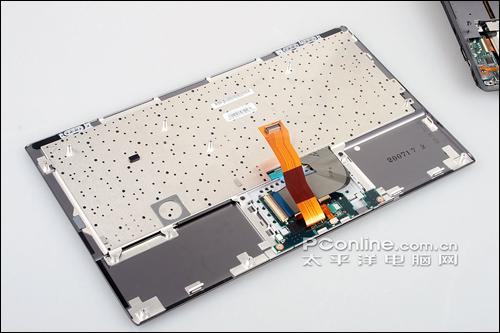 上面操作体验中我们已经提到过,索尼Z15的整个键盘相当稳固,没有任何松动凹陷等现象,从拆解可以看到,这主要得益于其采用了一体式成模设计,键盘按键与底架融为一体,从而保证了敲击输入的优秀体验。