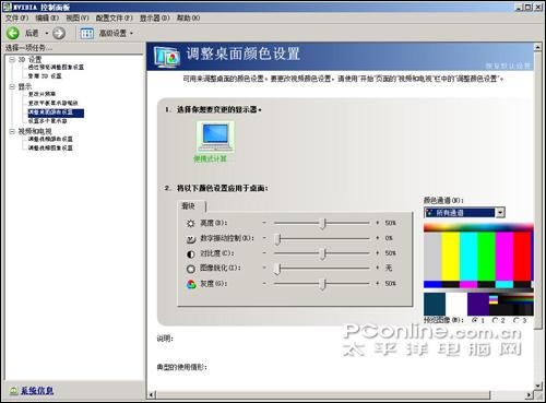 实际使用中我们发现在,在独显与集显模式下屏幕的各方面有着不同的表现,最为明显的是灰阶测试:在集成显卡模式下,灰阶测试中有9个暗格不能清晰辨认,而在独显模式下所有暗格均能清晰辨认,区别是十分明显的。究其原因是因为在独立显卡模式下其驱动提供了一个专业级的色彩调节和管理中心,能够使液晶屏的优质表现发挥到极致。