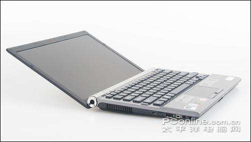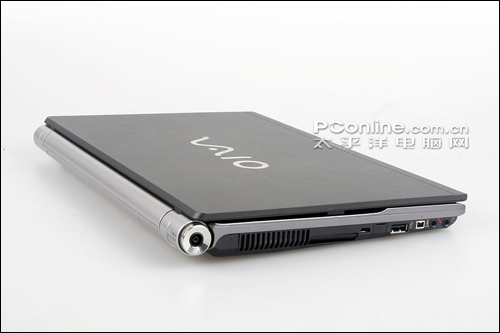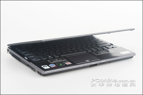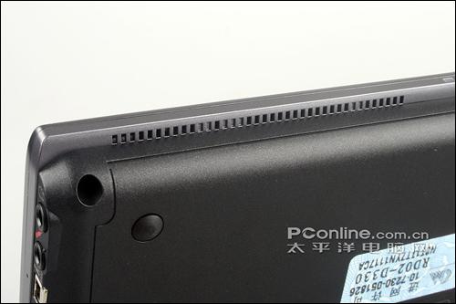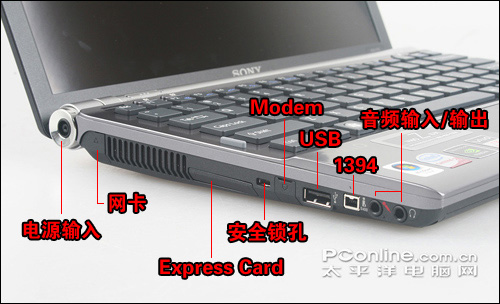 相比右侧接口来说,左侧的接口设计比较紧凑,同时对不太常用的几个接口使用了橡胶盖封住,保证了整体上的简洁美观度。不过安全锁孔设计的位置就显得有点尴尬了,因为如果加上硕大的机器锁的话,旁边的Express Card插槽和Modem接口似乎就用不了了,当然对于这么一款以移动为主的笔记本,相信也不会有多少人会经常拿锁链把它绑住吧,呵呵。