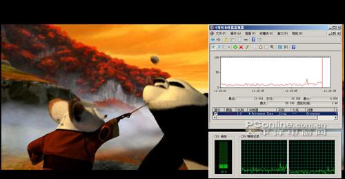 高清测试中我们选择了一个1080P高清《功夫熊猫预告片》作为片源,独显与集显模式下均能非常顺畅的播放,CPU占用率分别为27%和10%左右,让人相当满意。