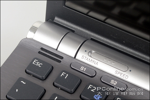 在S1和S2上方转轴处是一个显卡模式切换开关,在STAMINA时是使用主板集成X4500HD集显,在SPEED时使用的是9300MGS独显。显卡切换功能是索尼Z15整机的最大亮点之一,关于该功能详细介绍和测试在下面还会详细说到。