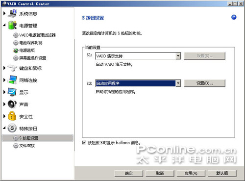 用户可以在VAIO Control Center里设置S1和S2的启动项目