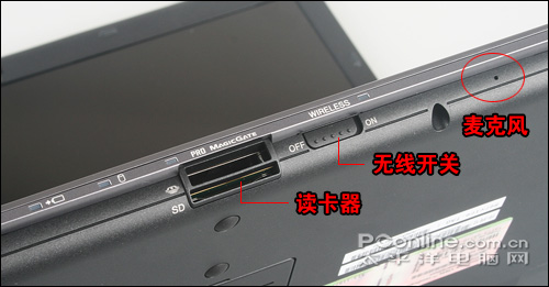 机身前沿有一组指示灯,分别表现供电供态和充电状态,以及硬盘状态。过来是读卡器,上下两个读卡器分别支持MS和SD卡,不过始终敞开的大门似乎有点影响美观。读卡器上方是一个指示灯。再过来是无线开关及相应指示灯。再再过来是外置麦克风,小小的并不起眼,但作用却很大,尤其是对经常需要视频会议的商务用户来说。