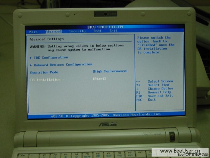 1、 开始按F2进入BIOS设置,讲OSInstallation设置为start。