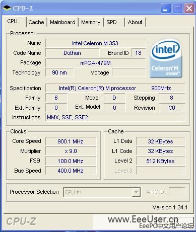 12、 CPU-Z截图,900MHz,915芯片组,DDR400,只有一个内存插槽。