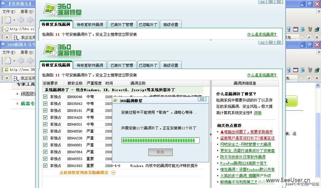 11、 安装360安全卫士,装了深度5.10后,截至到今天还有11个系统漏洞和一个软件缺陷要修补(比起我以前装XP SP2后要100多个漏洞好多了)。