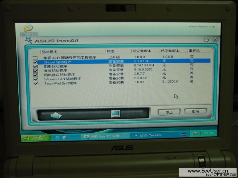 7、 安装华硕support CD里的驱动,这个过程好慢啊,不知道为什么?大概也是20多分钟,好在可以自动执行,无人值守。