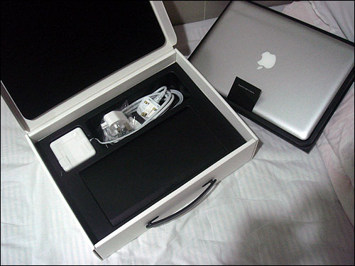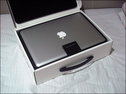 买机的时候大家最好带备一些测试用的工具,我的经验如下:MP3一首、黑、白、红、绿、蓝纯色图各一张(分辨率为1280*800)、光盘一张。MP3是拿来试扬声器的,而色图就是拿来试屏幕的,光盘主要测试光驱。在香港购机皇室堡的服务最好,专卖店屏幕5个点以上包换,而皇室堡的2C 3个点以上包换,不过新一代的MB很少出现这些情况。新机会用一个纸箱包着,外边印有标签,对好号码就可以拆封了。拆开之后,就是下图的盒子。