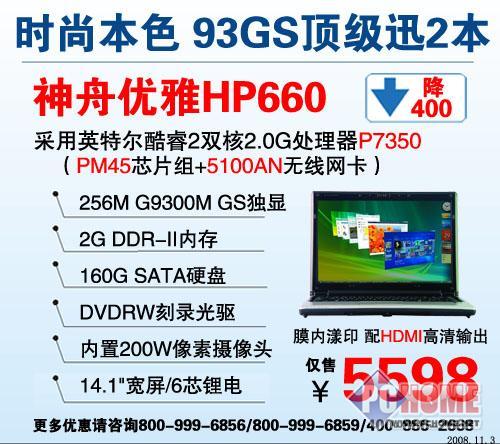 许多经常玩游戏而又对笔记本预算比较敏感的同学可能最为看重的就是笔记本的性价比了,说起性价比自然要提到大名鼎鼎的“价格屠夫”-神舟同学,随着迅驰2的大量上市,神舟也是改头换面,推出了采用全新模具的HP660笔记本,膜内漾印等高档技术都用上了,价格还是那么超值。神舟新一代14寸靓本优雅HP6(参数 图片 文章 热评 系列)60凭借英特尔酷睿2处理器P7350动力完美打造的卓越性能及无线扩展功能,搭配全新的256M G9300MGS顶级显卡,全新的膜内漾印技术,梦幻涟漪般的花纹高贵优雅,整机设计时尚,全面的接口配置,满足不同消费人群的需求,出色性价比,相信许多朋友都将其作为了开学购机的首选。现在的报价仅5598元。