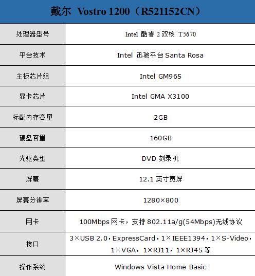 配置方面,这款戴尔Vostro 1200(R521152CN)笔记本采用了Intel酷睿2双核T5670处理器,Intel GM965主板芯片组,Intel GMA X3100显卡芯片,及Intel 3945ABG无线网卡;配置了2G双通道DDRII内存、160G硬盘、DVD刻录光驱;预装Windows Vista Home Basic操作系统。