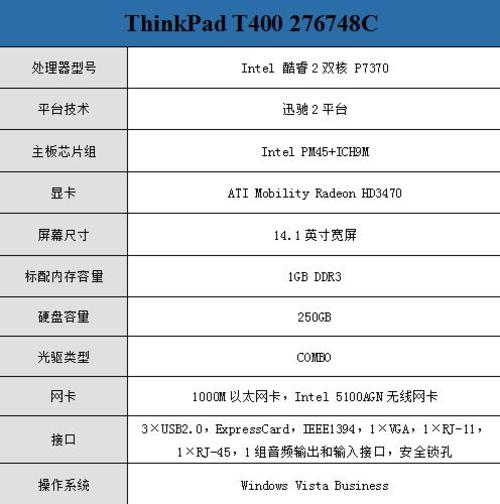 配置方面,联想ThinkPad T400(276748C)采用Intel酷睿2双核P7370处理器,主频为2.0GHz,性能相当不错。并且,搭配了Intel PM45主板芯片组、ATI Mobility Radeon HD 3470独立显卡;配置有1GB DDR3内存、250GB硬盘和Combo光驱;预装Windows Vista Business操作系统。