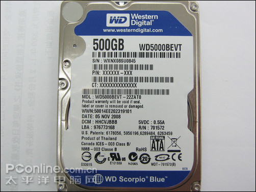 新品到货的西部数据 SATA 500G/5400/8M(WD5000BEVT)采用了新的外观设计,其实也就是更换了新的标签贴纸,上面拥有清晰的蓝色标志,让消费者清楚自己购买的是什么定位的产品。