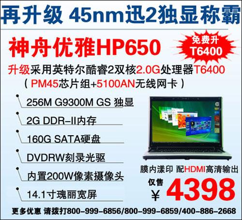 神舟一直占据着市场笔记本性价比的制高点,这款优雅HP650又免费升级至T6400处理器,搭配256M G9300MGS顶级显卡,时尚的膜内漾印外观,优雅的整机磨具设计,完美演绎迅驰2独显本的魅力。
