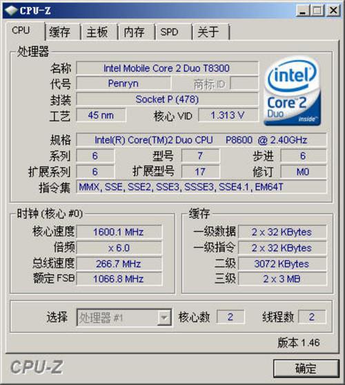 处理器 | Intel Core 2 Duo P8600 @2.4GHz |