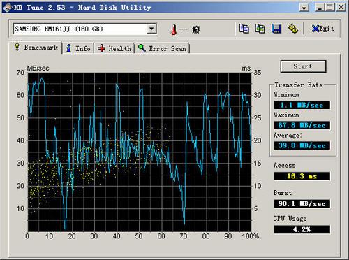2GB DDR3内存表现还算不错,不过三星的160GB硬盘则不太理想了,从HD Tune测试可见到,其传输速率一般,且CPU占用率控制不错。