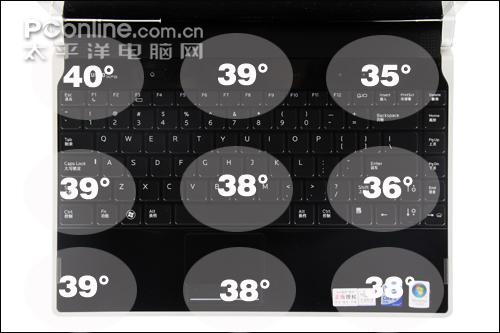 戴尔XPS M1340的散热控制欠佳,主要的升温区域在左侧,左侧键盘下方是处理器及显卡部件,而左侧腕托则为硬盘所在地。其它区域控制得都相当不错,键盘C面平均温度大约为37-8度左右,对操作舒适度稍微有影响。