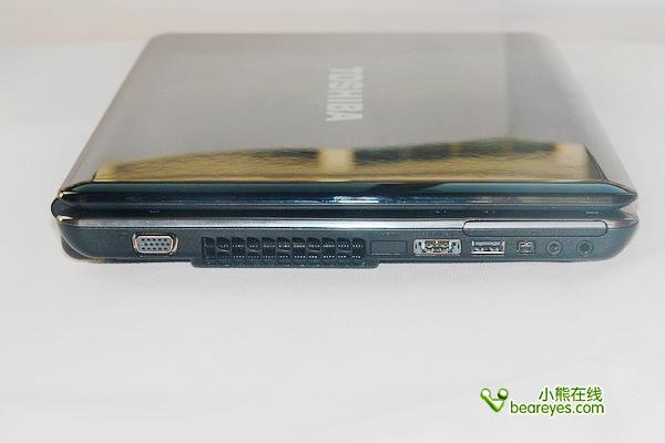 机体左侧的接口十分丰富,是M331的核心配置。从左至右分别为:VGA视频接口、风扇散热孔、e-SATA接口、USB2.0 接口、1394接口、音频I/O接口以及上方的Express-Card读卡器。以往设计在机体右侧的散热孔为很多笔记本用户所诟病,吹出的热风让操控鼠标的右手很不舒服,而Satellite M331左侧设计的散热孔为使用者免去了这一烦恼。