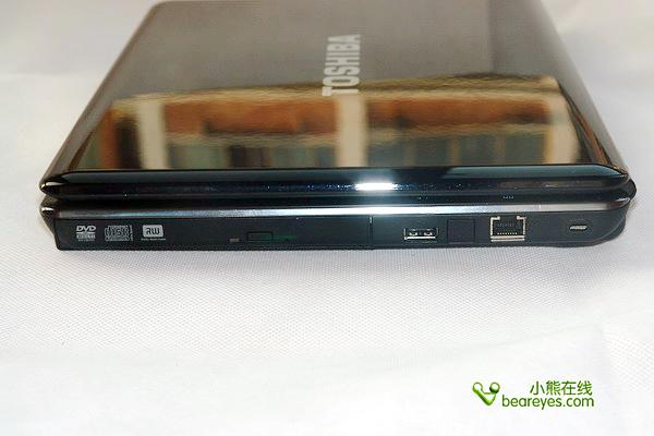 机体右侧,Satellite M331配置了一部DVD SuperMulti双层刻录光驱,同时还设计有一个USB2.0接口、一个RJ45网络接口以及一个安全锁孔。很多朋友使用笔记本时都有外接鼠标的习惯,而右侧的USB接口正是方便这些用户的精心设计。