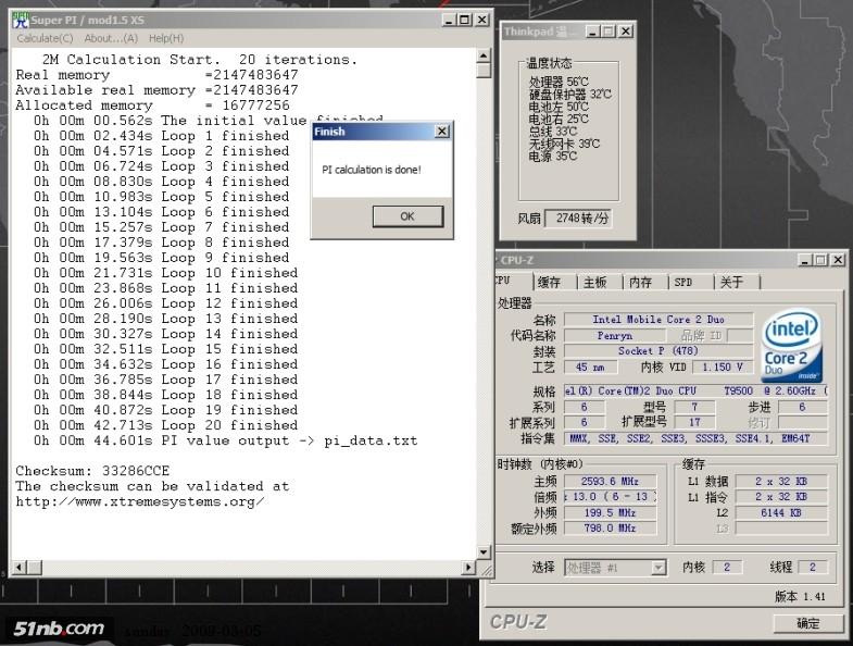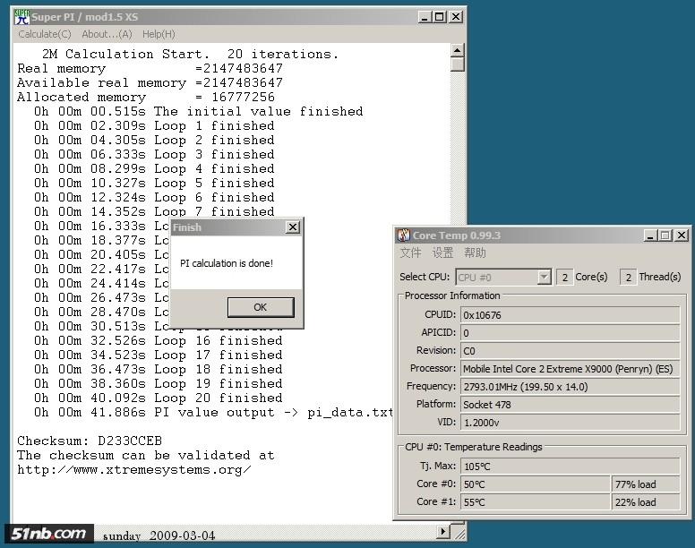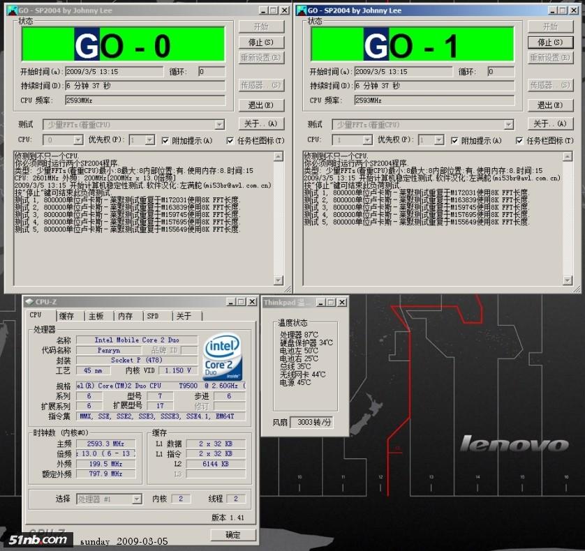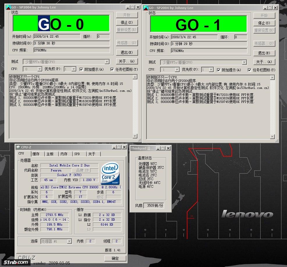 2、运行SP2004测试稳定性时温度变化说明:X9000的发热量远大于T9500。