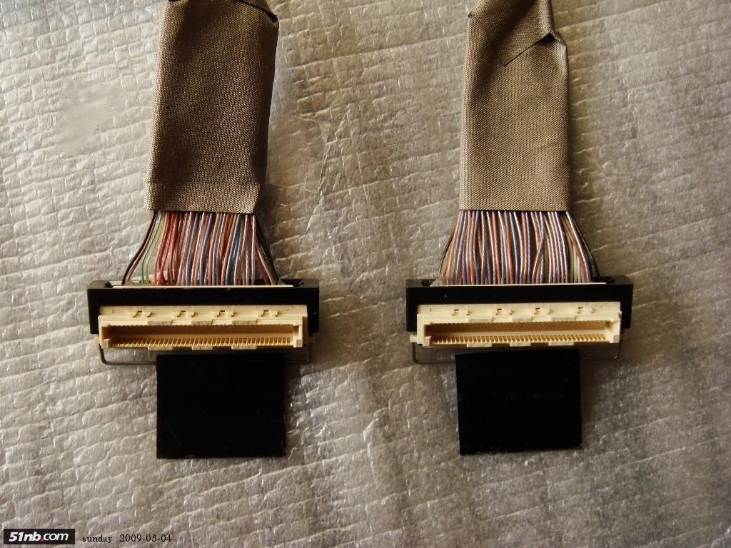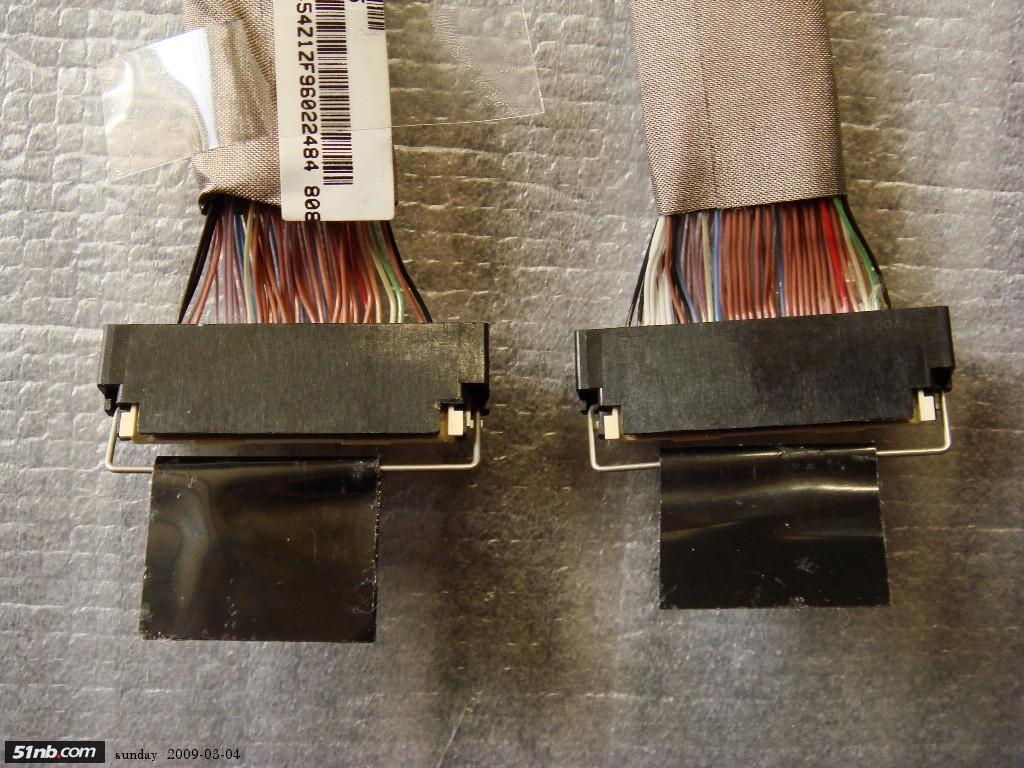 左侧是R61E 7649-A56的原配屏线,右侧是有蓝牙接口的WSXGA+屏线。可以清晰地看到原配屏线少了很多数据线。