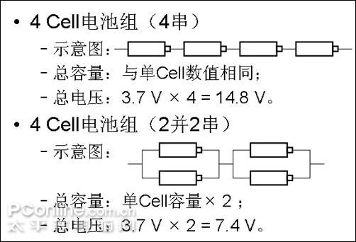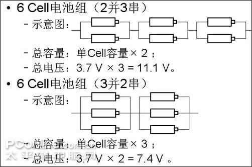 多芯电池组的构成,主要由串并联方式连接,串联方式为:电量不变,电压相加;并联方式:电压不变,电量相加。相关细节可以参看图3。以三星笔记本产品为例:3 Cell电池组,目前只有ND10采用;4 Cell电池组结构以串行为主,上一代产品多采用,如X11、R20等;6 Cell电池组,基本为2并3串结构,主要被现役产品采用。