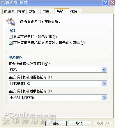 2. 在“高级”选项卡中,用户可以选择要使用的节能设置,比如当选择了“总是在任务栏上显示图标”复选框并应用后,在桌面上的任务栏上出现插头样的小图标,还可以对有关电源按钮的选项进行设定。