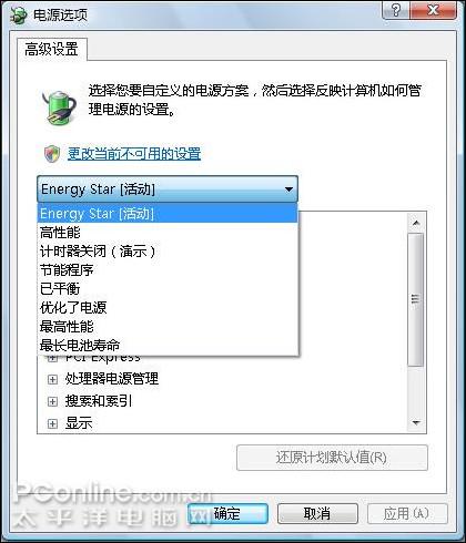 5. 在上述三个选项卡中,用户也可以通过“更改高级电源设置”选项,来进行更为全面的节能设置,这级选项卡中覆盖的层面非常多,诸如:显示外观、响应时间、屏幕亮度等都有涉及 ,用户可以更觉得更加方便易用。