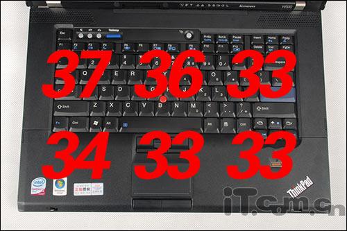如此众多的高性能配件被安装在一个狭小的笔记本身躯里,机器本身的发热量可想而知。Thinkpad以往产品在散热方面给人们留下的印象都是正面的,此次Thinkpad也没让我门失望,笔者在测试的过程中,随机测试了一下笔记本的机身上各区域的温度,测试结果还是比较让人满意的满意。键盘面只有左上角的温度超过了37度,其他几个区域对温度的控制都非常理想,腕托处几乎感觉不到热量。机身底部的表现让人感到有些遗憾,最高温度的地方到达了42度,不太适合放在身体上使用。