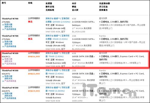 在W系列产品中,除了W500还有大名鼎鼎的双屏产品W700,W700的定位相对的要略高于W500,在产品的配置上可以直接的看出来(如下图),两者最明显的区别在机身的尺寸上,W500是15英寸的笔记本产品,而W700则是一款17英寸的产品。送测的这款Thinkpad W500具体型号为Thinkpad W500(4063RC1),是目前W500系列产品中最高配的型号,官方报价34999元。