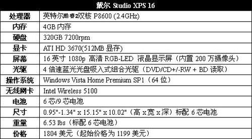 戴尔Studio XPS 16的配置如下: