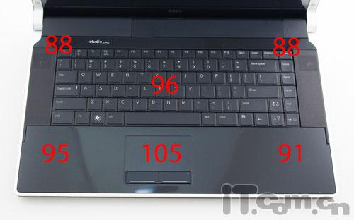 散热和噪音当处理器和显卡在测试时非常努力的运行时,机器就开始有一点热了。在做了多个基准测试、看了30分钟蓝光电影之后,很不幸的是Studio XPS 16变的热了……隔着牛仔裤你就能感受到机器的热度。我们在运行高性能处理器和显卡都会产生很大的热量,风扇似乎没有把热量及时的散发出去,所以机器的温度就变的很高。如果你对笔记本散热性能很在意的话,可能因温度太高而不能把这款高端配置的笔记本作为笔记本使用。下面是测试的温度,单位为华氏摄氏度。