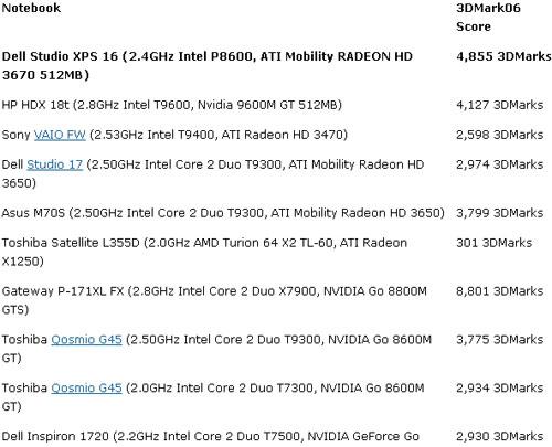 所有列出产品的3DMark06测试是在1280x800或1280x768的分辨率下做的,Studio XPS 16在1920x1080分辨率下的3DMark06得分为3,501。