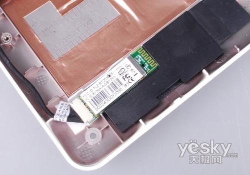 电池左下角还有一块芯片是无线网卡,通过一条黑色线缆连接至主板处,这样做也是最大化利用内部空间。