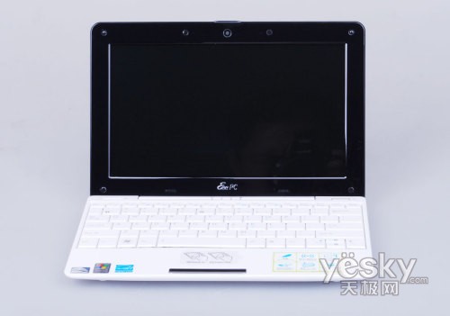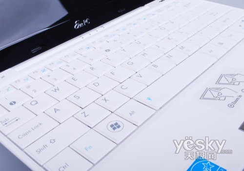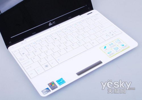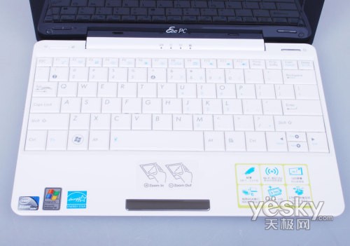 转轴下方紧接就是键盘,设计非常紧凑,在经过两代产品的发展,华硕EeePC在键盘设计上也越来越成熟。采用92%全尺寸键盘,键盘键程和弹性也接近于普通笔记本的手感。可说在键盘设计相对于一代产品有了很大提升。