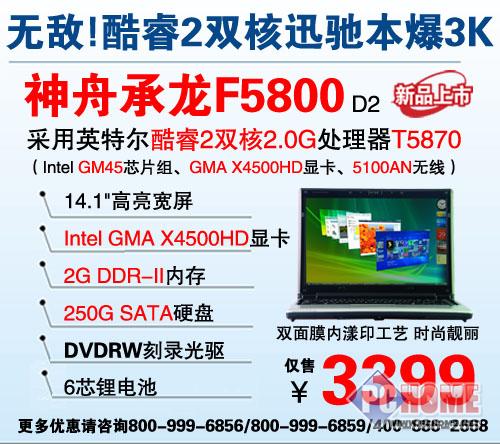 配置上,承龙F5800采用了Intel酷睿2双核T5870处理器和Intel GM45芯片组搭配2G内存;存储上,250GB硬盘和DVD刻录机;显示上,14寸宽屏和GMA X4500HD显卡。